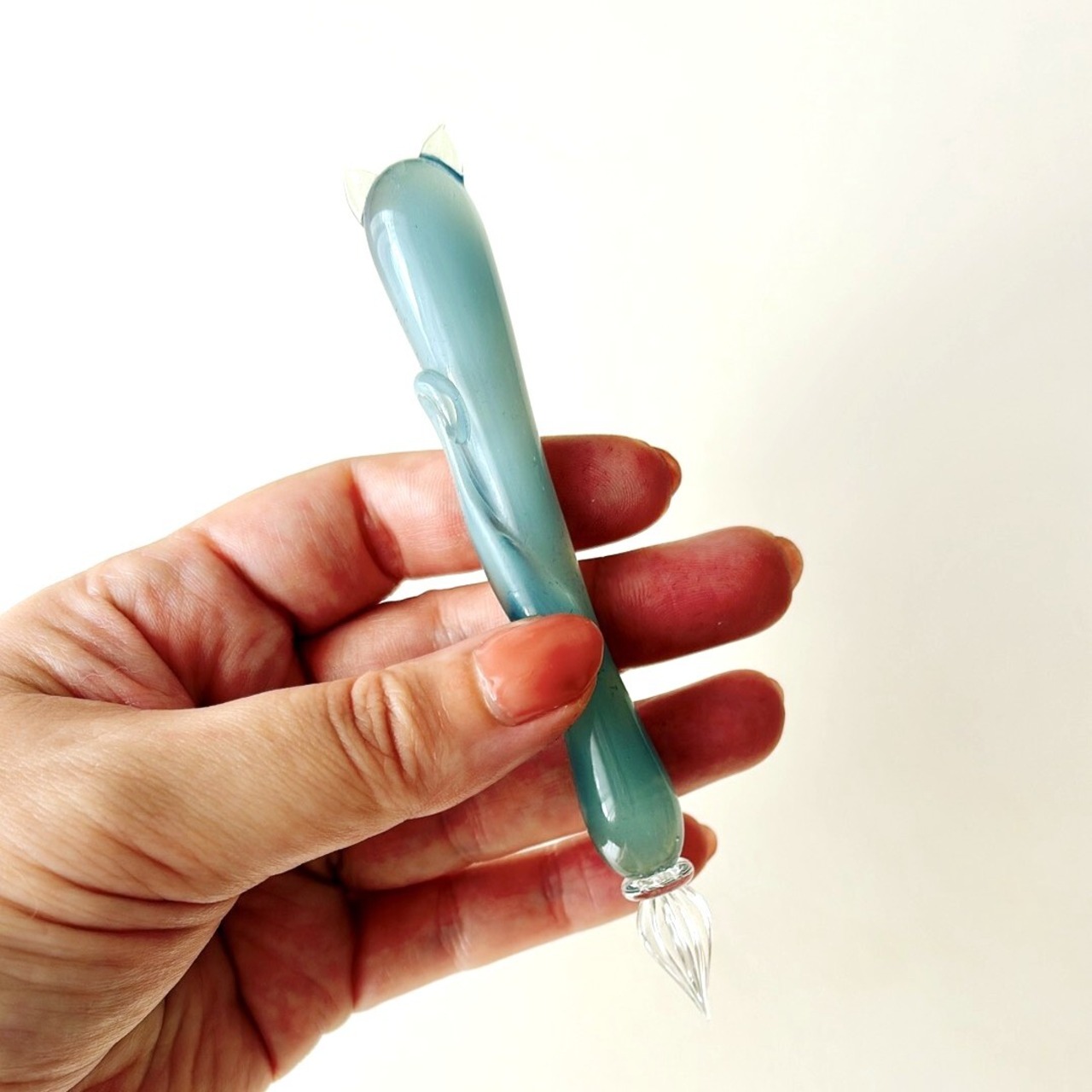 くるんとした尻尾は転がり止めの役割も。手にフィットする持ちやすさも魅力です。短めのボディで取り扱いやすく、ガラスペンが初めての方にもおすすめの1本です。